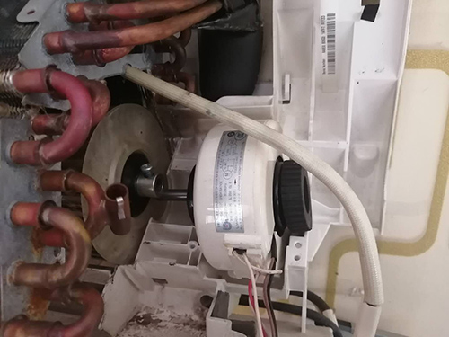 大家可以發(fā)現(xiàn)這個(gè)電機(jī)底座已經(jīng)變色,變形,電機(jī)下沉后,風(fēng)筒也下沉,和機(jī)殼摩擦,噪聲就很大了。