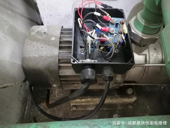 到了茶樓后首先檢查電源,未開啟,用戶也說之前開啟后就跳閘了,就沒有再去開過,檢查發(fā)現(xiàn)空開已經(jīng)跳開,于是先把機(jī)器打開,檢查有沒有短路的地方,首先想到是壓縮機(jī),主機(jī)內(nèi)有兩臺(tái)5P壓縮機(jī),用搖表檢查了所有的壓縮機(jī)接線后沒有發(fā)現(xiàn)問題,看來不是壓縮機(jī)壞了,接著檢查風(fēng)機(jī)也沒有發(fā)現(xiàn)短路,循環(huán)水泵檢查發(fā)現(xiàn)線圈阻值不正常,它這個(gè)循環(huán)泵也是用的三相電源,接觸器引線有三條用萬用表檢測(cè)阻值已經(jīng)無窮大,顯然水泵是燒了,打開水泵電機(jī)外殼,發(fā)現(xiàn)里已經(jīng)完成燒斷。